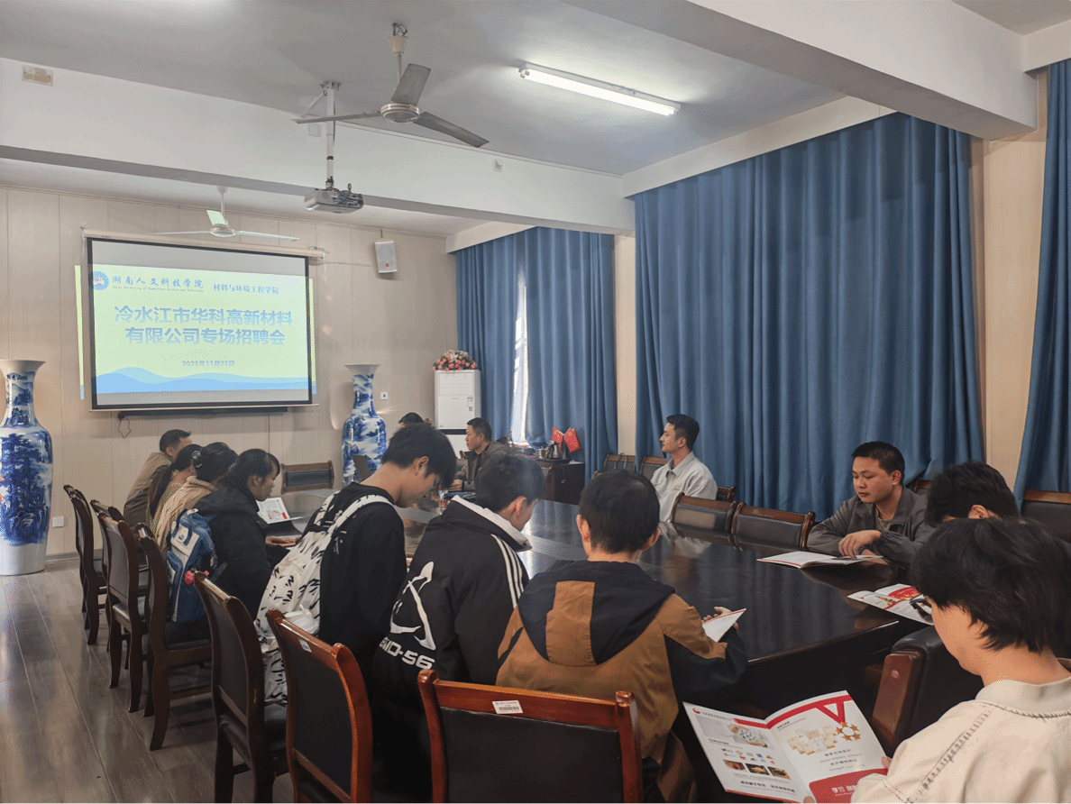 为搭建校企人才精准对接桥梁,助力2026届毕业生高效就业,11月27日下午,材料与环境工程学院在多闻楼410成功举办冷水江市华科高新材料有限公司专场招聘会。学院党总支副书记王新辉、2022级材料科学与工程专业在校学生共同参与活动,与企业代表展开深度交流。