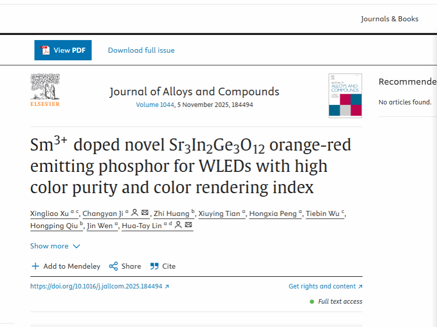 近日,材料与环境工程学院汲长艳博士领衔的团队在材料科学领域国际知名期刊《Journal of Alloys and Compounds》(《合金与化合物期刊》)发表重要研究论文,题目为“Sm3+ doped novel Sr3In2Ge3O12 orange-red emitting phosphor for WLEDs with high color purity and color rendering index”(《Sm3+掺杂的新型Sr3In2Ge3O12高色纯度和高显色指数橙红色荧光粉用于白光发光二极管》)的研究论文。该团队许星燎(贝博硕士研究生)为论文第一作者,汲长艳博士为第一通讯作者,ballbet贝博bb艾弗森为该论文的第一通讯单位。