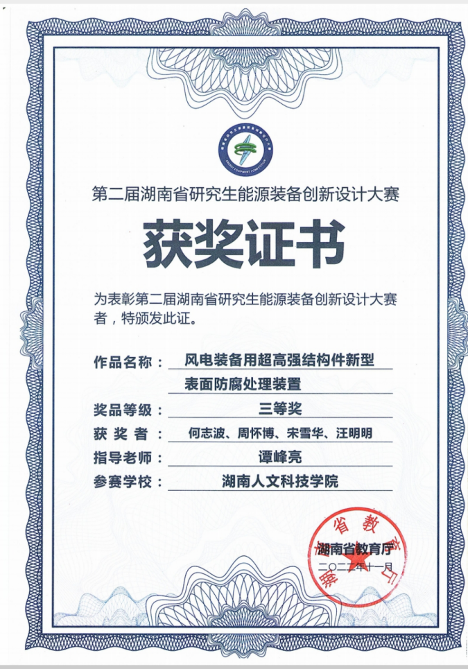 近日获悉,在此次大赛中,由我院谭峰亮博士指导,何志波、周怀博、宋雪华、汪明明的作品《风电装备用超高强结构件新型表面防腐处理装置》荣获大赛三等奖!