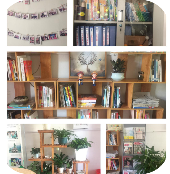 成长辅导室含有许多课外书籍、期刊杂志,还有许多生机勃勃绿色植株