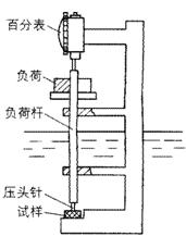 维卡软化点温度测试原理如下图所示。负载杆压针头长3~5mm,横截面积为(1.000+0.015)mm2,压针头平端与负载杆成直角,不允许带毛刺等缺陷。加热浴槽选择对试样无影响的传热介质-甲基硅油,室温时粘度较低。可调等速升温速度为(50±5)℃/h,试样承受的静负载G=W+R+T(其中,W为砝码质量;R为压针及负载杆的质量;T为变形测量装置附加力),本实验装置R+T为0.088kg。负载有两种选择:GA=1kg;GB=5kg。测量形变的位移传感器精度为±0.01mm。