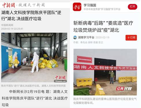 新冠疫情期间,捐赠给武汉的21套垃圾处理装备,在雷神山医院共处理了261.5吨医废垃圾,日处理量最高达8.63吨,有效帮助武汉等疫情严重地区解决抗疫一线口罩、防护服、医疗废弃物、饭盒等医疗干、湿复杂垃圾的处理难题,成为娄底唯一一家援助湖北的非医疗单位,为湖北抗击疫情做出巨大贡献。医疗废物处理神器因此被经济日报等近20家媒体宣传报道,相关视频在抖音上获赞已达186.6万,湖北省生态环境厅等单位亦发来了感谢信。