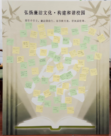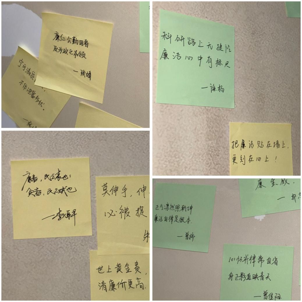 活动精心设置了一面廉洁主题便利贴共创墙,全体党员结合自身材料与环境工程的专业背景,深入思考并寻找能够象征廉洁品质的材料或环境元素,他们将这些富有深意的 “廉洁格言”与个人的庄严承诺一同书写在便利贴上,郑重地粘贴于展板之上,共同构筑起一道亮丽的“学院党员清廉文化展板”。