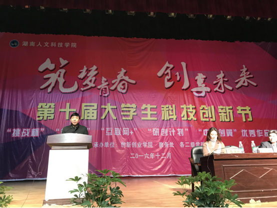 首先,石潇纯副校长介绍了第十届科创节的筹备以及学校今年参加各类创新创业赛事的组织情况;随后,美术与设计学院肖巧云同学代表竞赛团队发言,她带领的团队获得今年第二届“互联网+”大学生创新创业大赛国赛三等奖;接着,挑战杯决赛评委娄星区科技局副局长李健代表评委团庄严承诺公正评判。
