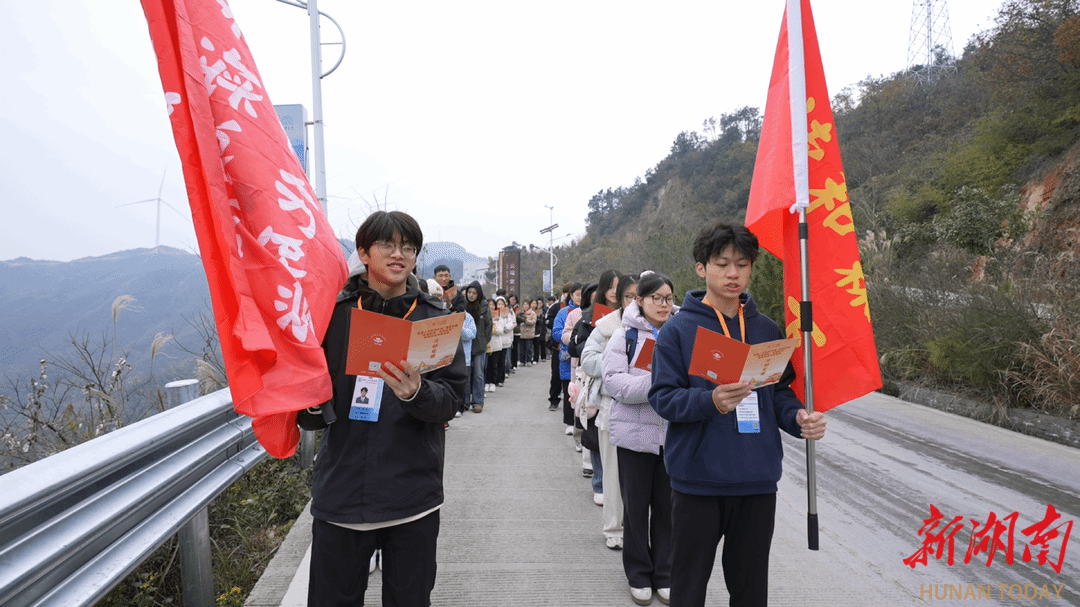 同学们与村干一道,在诵读蔡和森《少年行》之后,手举“走读湖湘”和“走读和森”的大旗,徒步攀登这座海拔818.8米的高峰,漫步云端,看群山莽莽,南岳独秀,摩天风轮直指苍穹,风情民宿起伏巉岩,大家迸发出无穷的创业激情和创新灵感。