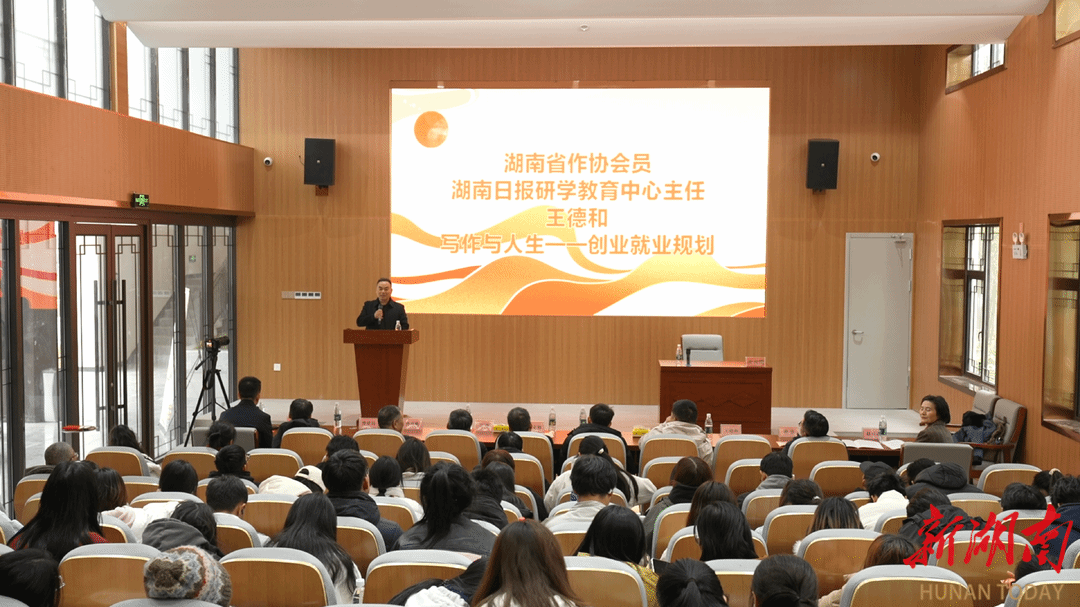王德和通过《写作与人生》和大学生分享了精彩的写作和工作历程,鼓励他们树立报国之志、练就过硬本领,拥抱新媒体,为乡村振兴、民族复兴而奋发图强。同时,他介绍了湖南日报社开展媒体深度融合发展,在省委宣传部指导下、与省文物局共同开展走读湖湘文物文化研学项目情况,希望与全省各地共同打造研学旅游IP。