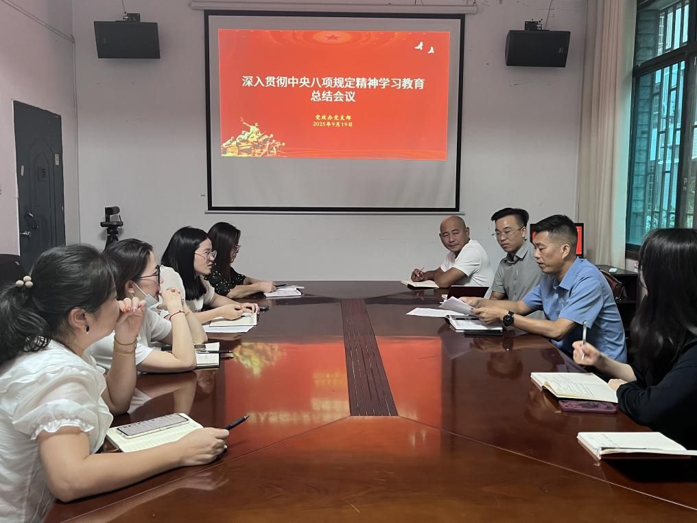9月19日下午,党政办党支部在明德楼218召开深入贯彻中央八项规定精神学习教育总结会议,旨在巩固学习教育成效,持续深化作风建设,推动中央八项规定精神见行见效。会议由党支部书记李玲军主持,全体党员参加。