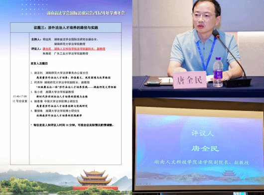 本次年会会以“坚持统筹推进国内法治和涉外法治建设 保障和服务湖南高水平对外开放”为主题并设“涉外法治理论和实践前沿问题”“湖南涉外法律服务能力建设”“涉外法治人才培养的路径与实践”等分议题。会议期间,与会专家学者围绕会议主题展开深入研讨。我院唐全民副教授在“涉外法治人才培养的路径与实践”分议题论坛上作为评议嘉宾发言并简要介绍了我院在法学实践教学和法治人才培养方面的特色与经验。