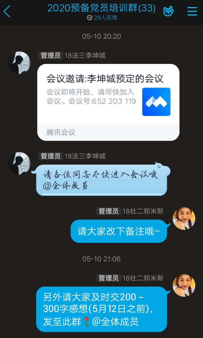 法学院2020年预备党员培训班 2020年4月26日至5月1日,法学院开展了为期一周的2020年预备党员培训班,培训分课程学习、交流研讨、撰写思想汇报、考试四个环节。受疫情影响,本次培训班通过线上会议的形式展开。一周的培训时间里,预备党员们积极并认真地学习相关视频,每天将学习笔记以文档的形式发在群里,进行学习打卡并在学习结束后发表自己的感想。