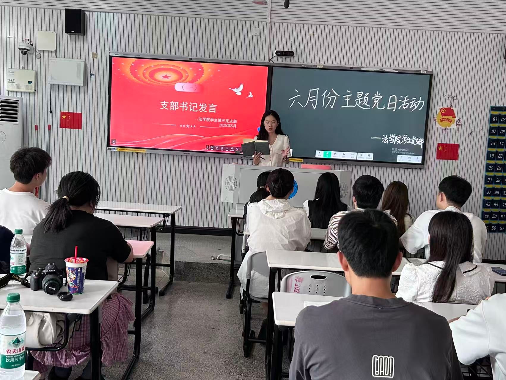 为深入学习贯彻党的最新理论精神,提升学生党员的政治素养与责任担当,6月6日—9日,法学院学生党支部在致远楼204教室组织开展了六月份的政治学习活动。