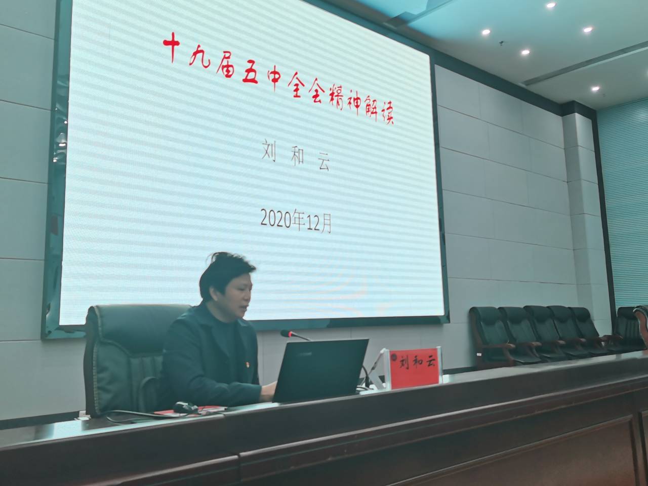 刘和云校长以六个部分为基础向大家解读了十九届五中全会的精神。第一部分,他向大家介绍了十九届五中全会的内容,指出十九届五中全会的召开对于我国经济全球化、经济高质量发展等方面的重要意义。第二部分介绍了我国在全面建成小康社会中取得的十方面决定性成就,并重点提到在脱贫攻坚、经济发展等方面取得的成就。第三部分解读了我国在国内外发展面临的机遇与挑战,要抓住机遇,迎接挑战。第四部分,他阐述了我国到2035年要实现的远景目标,向大家分析了改革、对外开放、创新对我国经济发展的重要性。第五部分解读了我国十四五时期经济发展的六方面主要目标,提出要实现经济国际双循环、国内大循环。第六部分,他讲解了实现奋斗目标的12个方面具体措施,鼓励全体党员要撸起袖子加油干。