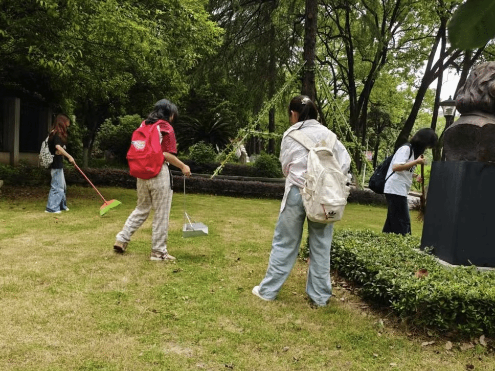 同学们手持扫帚、垃圾袋等工具积极投入清扫活动,雨后地上残留的落叶被清扫干净,草坪里散落的垃圾被捡拾殆尽,绿树下是他们忙碌而有序的身影,经过同学们的不懈努力,校园重新焕发出勃勃生机。