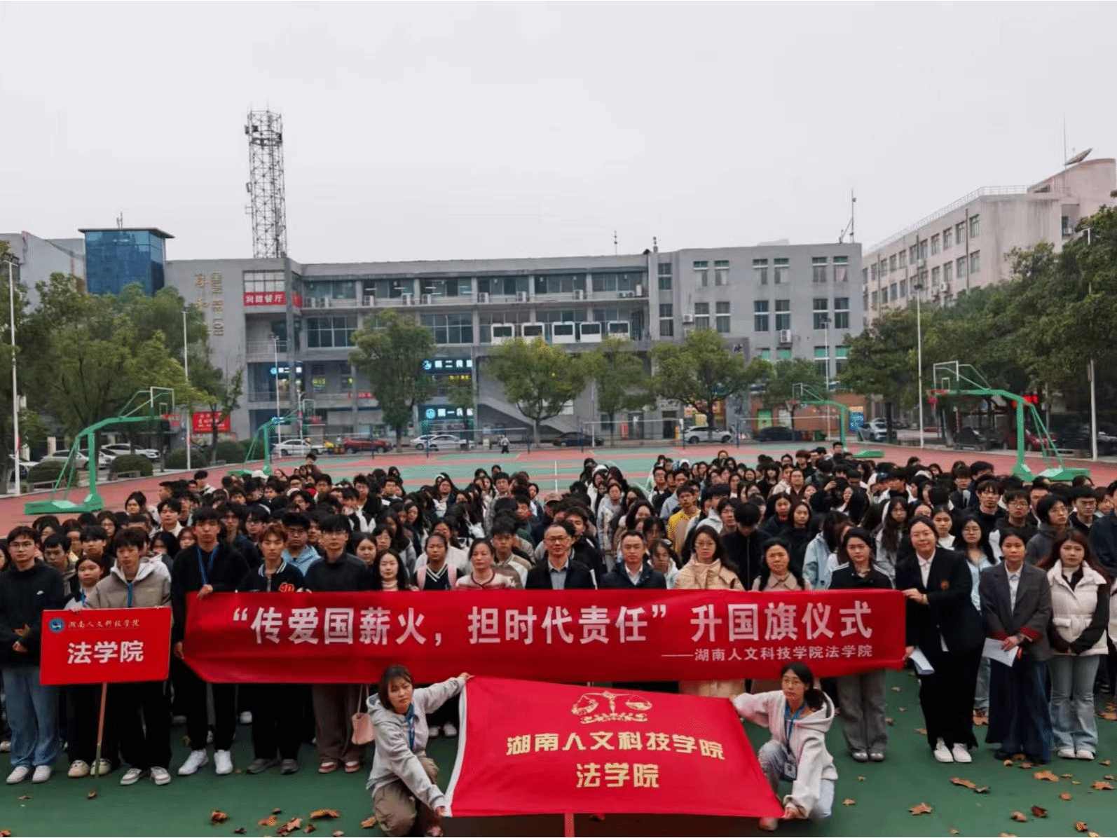 11月17日清晨,法学院于宇光球场隆重举行“传爱国薪火 担时代责任”主题升旗仪式。学工部部长曹宇、法学院党总支书记肖兵明、学工部副部长宋双等负责人,学工部黄茹老师、法学院全体辅导员老师及2024级、2025级全体学生参加,仪式由辅导员吴佳琪老师主持。