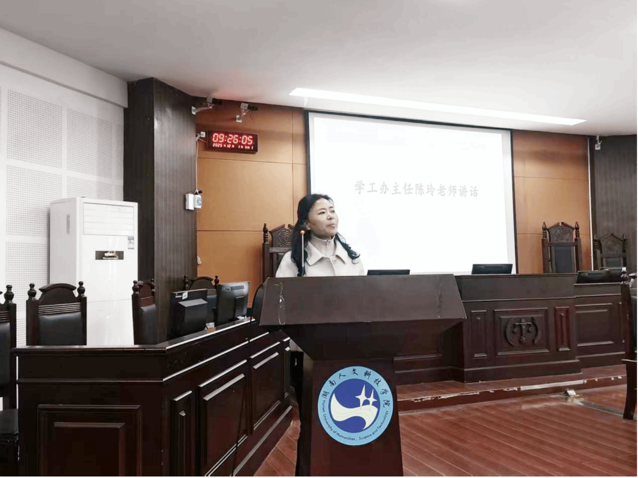 学工办主任陈玲对本学期学风建设工作作总结发言,特别肯定了“红色金曲竞猜暨法律知识竞赛”这一特色活动。她指出,该活动以轻松活泼的形式,既提升了学生的专业素养,也增强了家国情怀的培养。