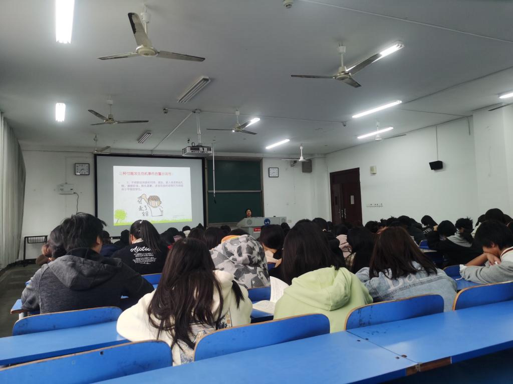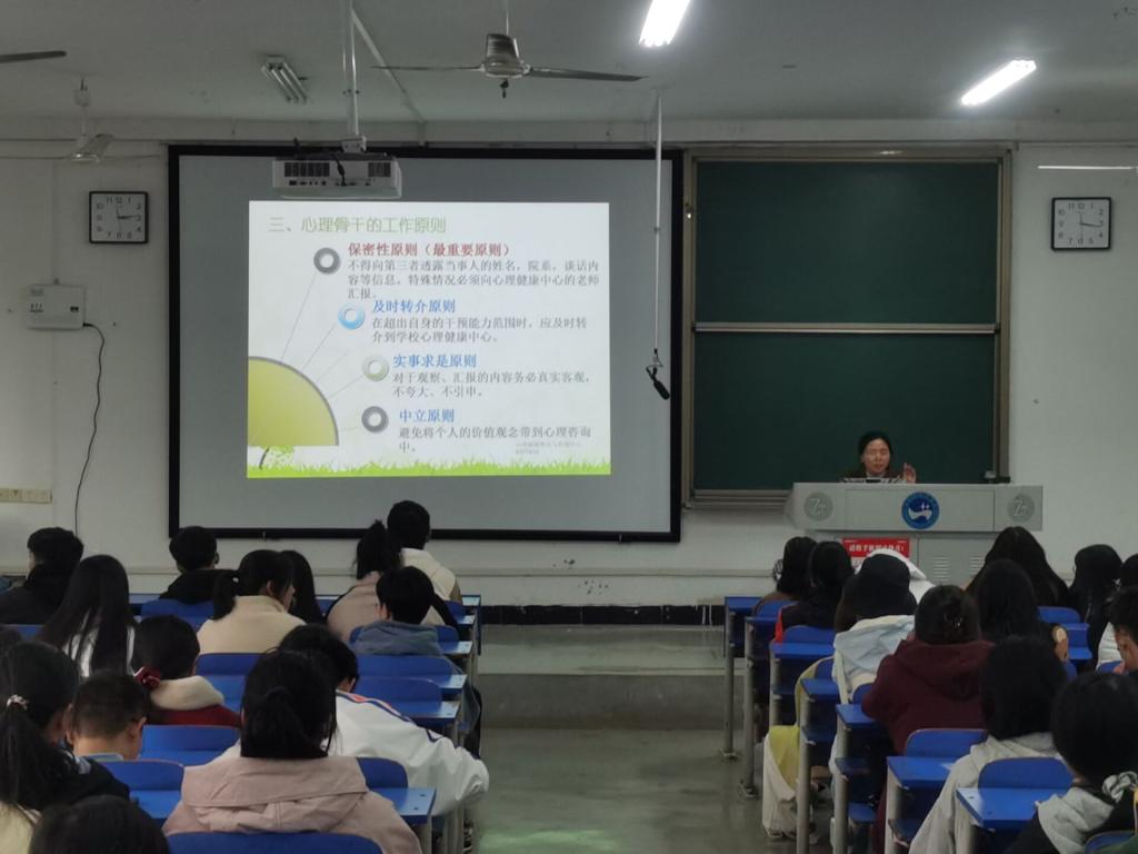 陈玲首先强调了我们需要关注的12种重点人群,然后从朋辈辅导员的工作职责、工作原则和工作技巧三大板块进行详细讲解。陈玲特别强调作为朋辈辅导员,要定期向班主任和辅导员报告本班学生日常心理状况,做到早发现、早沟通、早解决。除此之外,她详细讲述了保密性原则和及时转介原则,并以亲身经历为同学们敲响了警钟。她呼吁各位朋辈辅导员,要注意三种可能发生危机事件的警示通讯,要求发现后要及时去阻止、报告并积极提供帮助。