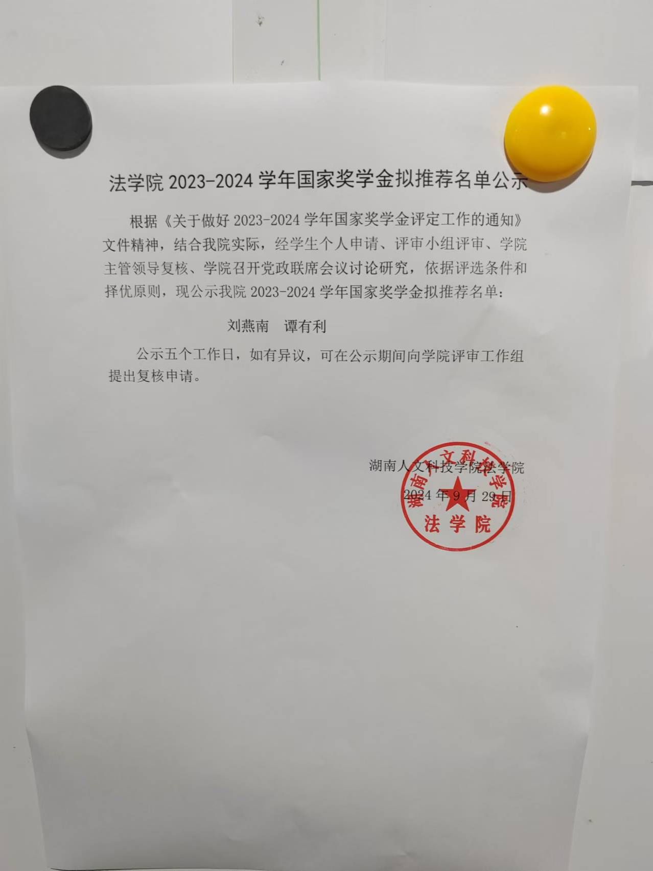 法学院2023-2024学年国家奖学金拟推荐名单公示