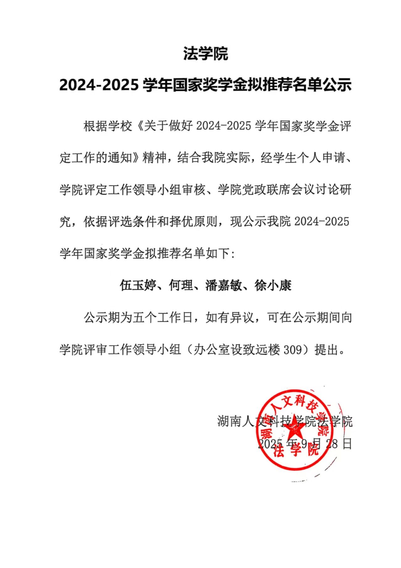 根据学校《关于做好2024-2025学年国家奖学金评定工作的通知》精神,结合我院实际,经学生个人申请、学院评定工作领导小组审核、学院党政联席会议讨论研究,依据评选条件和择优原则,现公示我院2024-2025学年国家奖学金拟推荐名单如下: