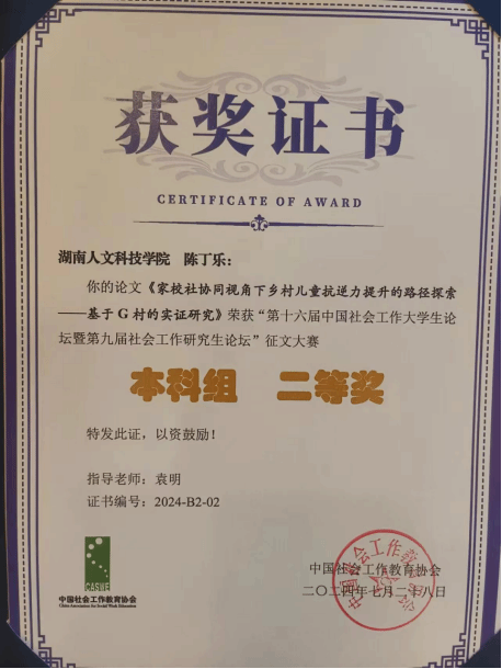 陈丁乐同学以扎实的理论功底、独到的研究视角和深入的实证分析,在众多优秀作品中成功突围。其获奖论文聚焦乡村儿童这一备受社会关注的群体,创新性地将家庭、学校和社区三方协同纳入研究视角,通过对 G 村的实地调研,深入探讨提升乡村儿童抗逆力的有效路径。该研究不仅具有重要的理论价值,更为解决实际社会问题提供了可行性建议。廖志宏同学以其论文 “小学校园欺凌现状、问题及对策研究 —— 以 A 小学为例” 在分论坛进行了精彩发言,为解决校园欺凌问题贡献了独特的智慧和见解。