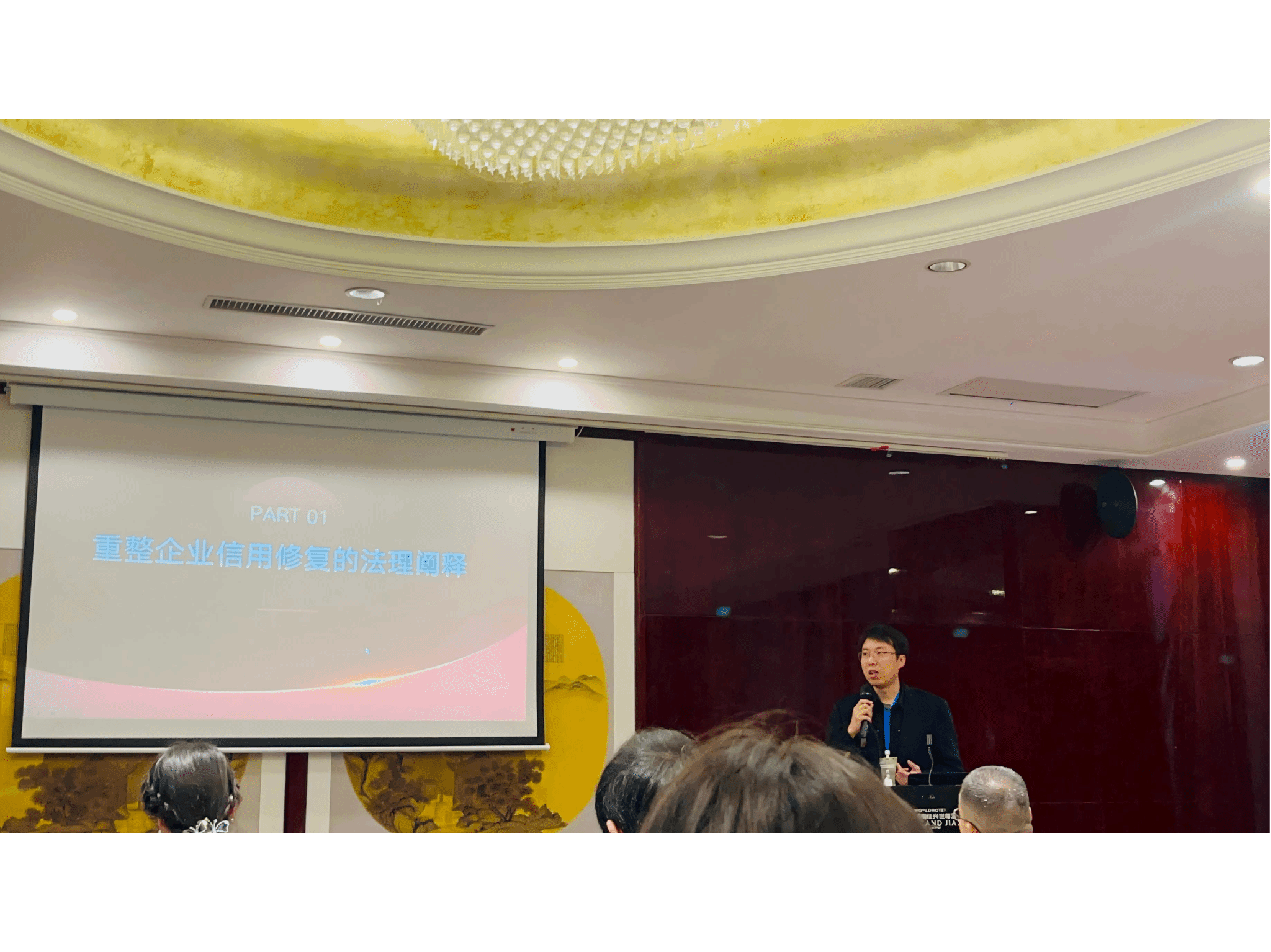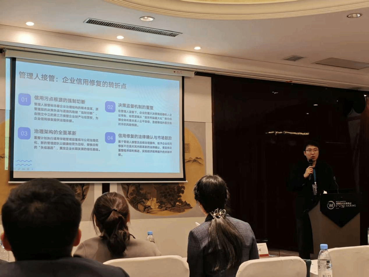 会上,孔鼎仟老师以“重整企业信用修复的法理阐释”为主题进行发言,从重整企业信用修复的法理基础、制度价值、实践困境及优化路径等维度展开分析,结合当前企业破产重整中的信用重建现实需求,提出了兼具理论厚度与实践参考性的学术观点,其分享内容引发了与会专家的积极互动与深入探讨。