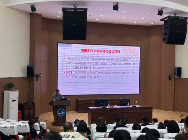 10月26日(周四)下午,学校在匠成楼报告厅召开了2023年高等教育质量监测数据采集暨编制发布《2022-2023学年本科教学质量报告》工作会议。刘建勋副校长主持会议。参会人员有各教学单位院长、分管教学工作副院长、教务秘书、质量监控联络员、数据采集人员;各主要职能部门相关负责人及质量监控联络员与数据采集人员;教务处、质量监控与发展规划处全体人员。