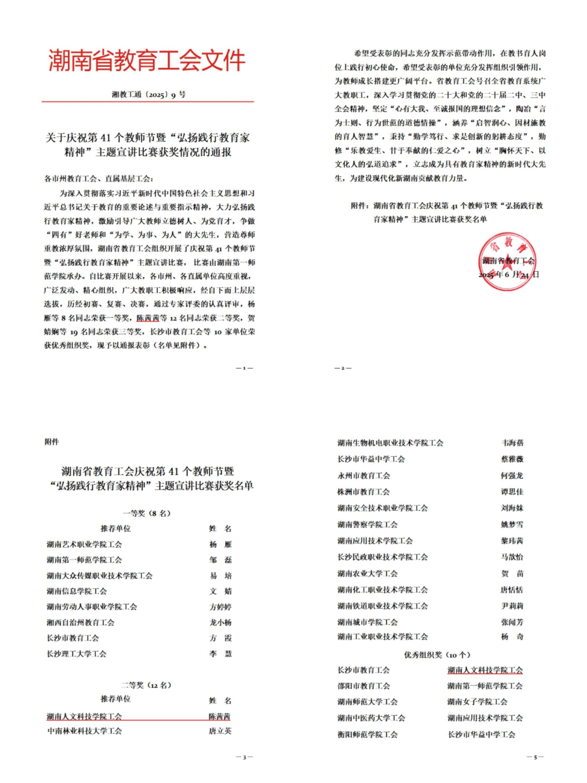 近日,由湖南省教育工会举办的“弘扬践行教育家精神”主题宣讲比赛决赛圆满结束。学校获得优秀组织奖,文学院教师陈茜茜历经全省初赛、复赛、决赛,最终从来自全省各市州教育战线的40名决赛选手中脱颖而出,荣获二等奖。