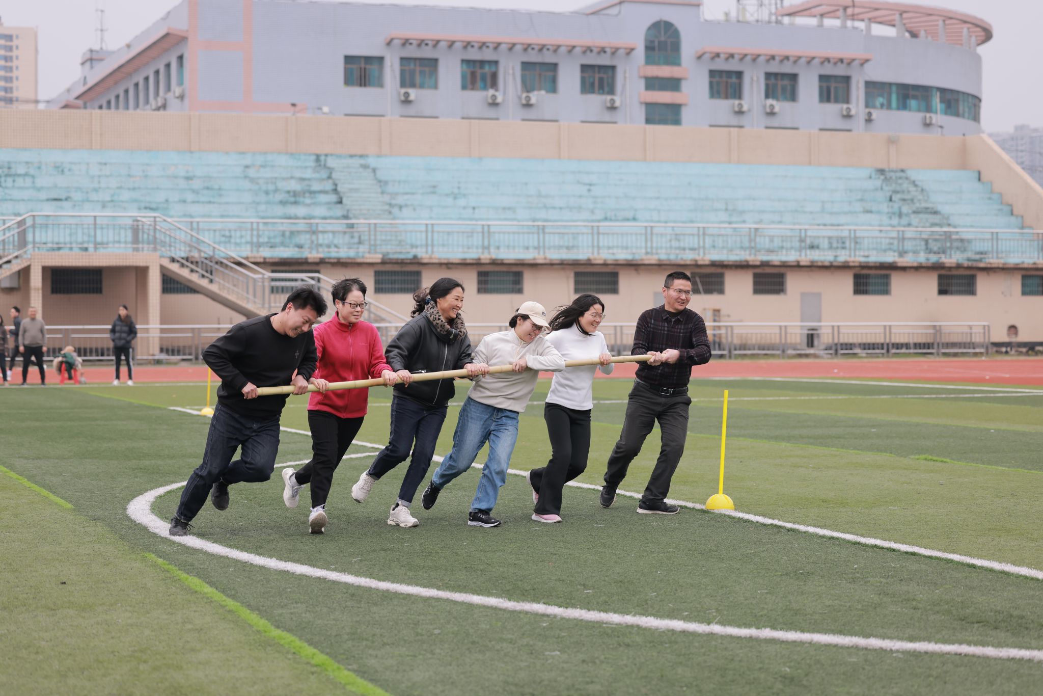 本次比赛以分工会为单位,共有49支队伍700余名教职工参赛。比赛为旋风迎面接力跑,每支队伍参赛队员为12名,其中女教职工不少于8人,男女平均分为两组,两组队员相隔40米相向站立,在每组正前方10米、20米、30米处各放一个标志杆。比赛开始后,由每一组运动员集体手握横竿以最快的速度跑至第一个标志杆,逆时针方向绕过标志杆,继续向前逆时针绕过第二、第三标志杆,将杆传递给本单位另一组队员,另一组队员用相同的方法完成比赛,用时最少的队获胜。赛场上,教师们化身为矫健的运动健儿,加速、绕圈、超越、交接……场上是运动员的坚韧拼搏,场下是观众们的热情呐喊。手中的横竿传递的是队员们的信任、希望,他们在赛道上你追我赶、不甘示弱,与对手激烈竞争,为集体荣誉而战。通过精彩而激烈地角逐,体育学院一队、能机学院一队、机三一队获得一等奖;体育学院二队、法学院二队、机二一队、机三二队、信息学院四队获得二等奖。