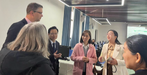 During the discussion, Prof. Chen Zhiguo expressed a warm welcome to the delegation from BSU, affirming the fruitful collaboration between the two universities over the years in talent cultivation, academic cooperation, and exchange. He expressed anticipation for deeper cooperation in various fields. Liu Xintian (Dean of the School of Business, HUHST) and Polly successively introduced the faculty, academic conditions, majors and courses, and international cooperation of their respective business schools. Friendly and frank discussions were held on advancing collaborative programs, faculty and student exchanges, teacher training, and student exchange programs. After the meeting, Benjamin and other members of the delegation visited the training rooms and laboratories of the School of Business, HUHST.
