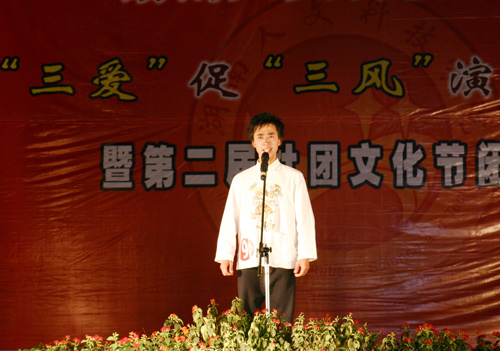 院长助理刘铁铭以热情洋溢的致词拉开了比赛序幕,他指出:为贯彻胡锦涛总书记在教师节上的重要讲话,我院举办抓“三爱”促“三风”等系列活动,并取得了良好的效果,此次演讲比赛将掀起新的高潮。他强调:爱生是老师博爱的情愫,爱师是学生感恩的回报,爱校是师生共有的情怀,学风浓、教风严、校风正,是师生共同的目标。最后,他预祝本次大赛圆满成功。