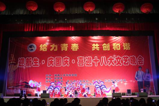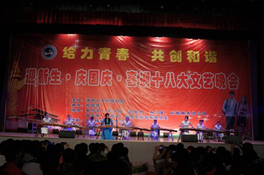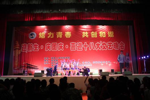9月27日晚,主题为给力青春·共创和谐-----2012年迎新生·庆国庆·喜迎十八大文艺晚会在学校体育馆隆重举行。校领导李尚益、刘铁铭、李凤莲等出席晚会,近三千名师生观看了演出。