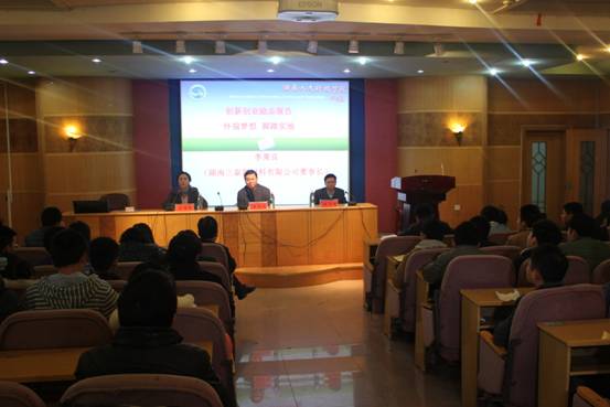3月13日下午,湖南三泰新材料股份有限公司董事长李聚良以“怀揣梦想,脚踏实地”为主题的大学生创业知识讲座在学校养根楼多功能报告厅举行。讲座活动由石潇纯副校长主持,陈志国副校长代表学校给李聚良董事长颁发兼职教授聘书,全校就业指导老师及200多名有创业意愿或已在创业的同学参加了讲座。