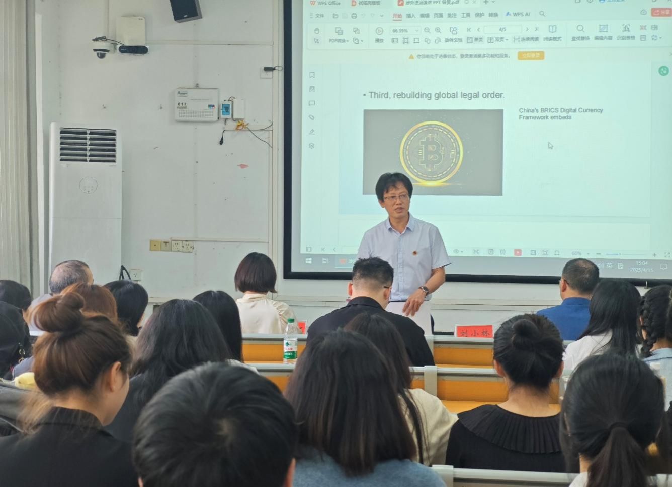 4月12日,所有参赛选手在致远楼208教室参加了笔试。4月15日,法学院在致远楼208教室开展了本次大赛面试演讲环节的比赛。院长朱耀斌首先说明了举办本次大赛的目的,并勉励参赛选手们珍惜机会,以赛促学,以学促用,为将来成长为涉外法治人才奠定坚实基础。法学院副教授谢常红老师、王演兵博士、刘小林老师 担任面试环节评委。本轮面试是对选手法学专业知识和涉外法治综合素养的综合检验,选手们围绕涉外法治热点问题做了精彩纷呈的主题演讲,比赛现场气氛紧张有序。三位评委老师依据演讲内容、语言表达、形象风度等方面进行综合评分。
