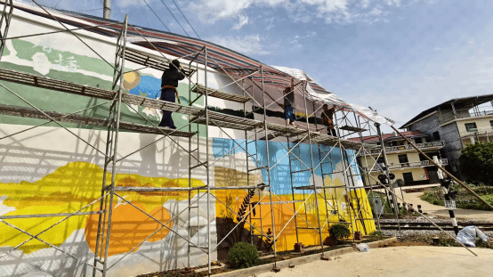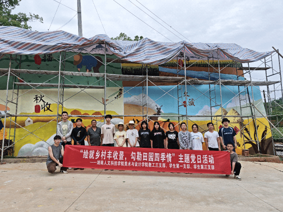 5月21日,美术与设计学院教工三支部、学生一支部和学生三支部组织师生到涟源市渡头塘镇开展主题党日活动。在创作前期,师生们深入调研渡头塘镇的风土人情、农耕文化特色,结合乡村实际环境,精心设计墙绘图案。绘制现场,师生们充分发挥专业所长,手持画笔、调色板等工具,在墙体上认真勾勒线条、细心填充色彩。大家各司其职,又相互配合,手中的画笔在墙面上穿梭,勾勒出一幅幅生动的画面。在创作过程中,学生们不仅锻炼了绘画技能,更在实践中体会到了艺术的魅力和价值,实现了从“知”到“行”的转化,真正实现了美育育人的目的。经过师生们四天的共同努力,两组别具匠心的墙绘作品精彩亮相,为乡村增添了绚丽色彩与文化韵味。