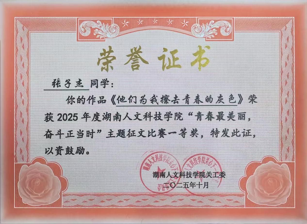 大赛不仅为学生提供了展现自我的平台,更让“奋斗”二字真正走进青年心中——许多学生在征文中分享了自己备考的坚持、实践的收获、克服困难的勇气,通过文字梳理成长感悟,在交流中汲取前行动力。其中,文学院2025级网络与新媒体1班张子杰同学的作品《他们为我擦去青春的灰色》斩获全校第一名。这篇散文以细腻笔触勾勒出青春突遭重创后的绝望与救赎。最动人处在于转折处的温情——文学院书记、辅导员、班主任等用朴素的关怀刺破绝望的阴霾。那些看似平常的触碰与叮嘱,恰似星火点亮废墟,让少年在支离破碎中重新辨认出生命的温度。最终剪去长发写下“奋斗”的细节,完成了从灰色到彩色的涅槃,彰显困境中人性光辉的力量。据悉,张子杰同学于2025年10月加入娄底市作家协会,成为一名官方认可的文学新锐,已公开发表作品十余篇。文苑新蕾,竞相绽放,这股奔涌的青春力量,正谱写着学校未来璀璨的希望华章。