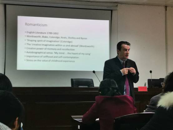 John Strachan教授首先介绍了自己的求学经历与研究方向,深入浅出地讲解浪漫主义诗歌的特点与精髓,带领在座师生领略英国文学的魅力;随后,他谈到了自己在世界各地访学与研究的经历,尤其是其在非洲的趣闻,言谈风趣幽默,在座师生听得兴味盎然;最后,教授介绍了英国巴斯斯巴大学的情况,并回答师生的现场提问。在场学生踊跃发言,还向教授推荐了中国的传统诗歌,气氛十分热烈。