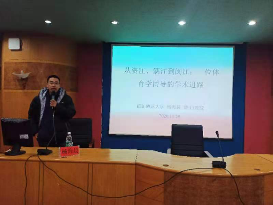 11月28日上午,应体育学院邀请,福建师范大学博士生导师杨海晨教授(原娄底高等专科学校体卫系9801班学生)在养根楼报告厅作了主题为“从资江、漓江到闽江:一位体育学博导的学术进路”的学术报告。讲座由体育学院党总支副书记谢嘉主持,体育学院师生共200余人聆听了报告。