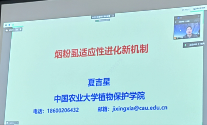 来自中国农科院的国家优青基金获得者(2020年)、中国青年科技奖获得者(2022年)、博士生导师郭兆刚研究员为论坛做了题为“小菜蛾对Bt杀虫蛋白产生抗性的分子机制”的主旨报告。报告从小菜蛾对Bt Cry1Ac毒素的抗性起源、传统靶标受体抗性等切入,系统讲解了过去20多年小菜蛾对Bt Cry1Ac抗性的研究进展,并结合自身10余年的研究经验以及近期的研究成果,揭示了小菜蛾不同中肠受体间的功能冗余性和分子互补作用模式,系统阐述了昆虫激素水平升高与串扰可以激活MAPK信号途径负调控多个中肠受体基因差异表达,从而导致了小菜蛾对Bt Cry1Ac的高抗性,为深入理解昆虫Bt抗性治理提供了重要的理论基础。之后,中国农业大学植物保护学院博士生导师夏吉星教授做了题为“烟粉虱适应性进化新机制”的主旨报告,报告阐述了烟粉虱通过水平基因转移的方式“劫持”了植物中酚苷丙二酰转移酶基因BtPMaT1用以代谢植物毒素,从而形成烟粉虱广泛寄主适应性的分子机制。为我们揭示了昆虫如何利用水平转移基因来克服宿主的防御机制,为探索昆虫适应性进化规律开辟了新的视角,也为新一代靶标基因导向的烟粉虱田间精准绿色防控技术研发提供全新思路。来自湖南大学的彭琼博士、湖南省农科院的李祖任博士、以及贝博郭开发博士、郑慧新博士和王双辉博士等分别作了题为野燕麦中除草剂代谢抗性基因的挖掘、植物源羊脂酸的抑草靶标活性挖掘与利用、抗黄精根腐病生防菌的筛选和菌肥研制、烟粉虱田间危害现状研究、EGCG通过调控内质网应激降低镉致秀丽线虫的发育毒性的学术报告。参与师生对学术报告进行了提问交流。