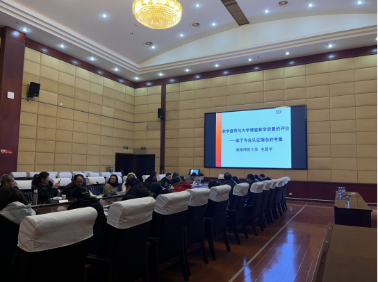 毛晋平是湖南师范大学资深心理学教授、博士生导师,长期从事教育心理学研究,近年来又担任了学校的教学督导。毛教授结合自己的专业研究、担任教学督导工作的体会,主要从教学督导的使命和责任、专业认证的基本理念、基于专业认证基本理念如何开展教学督导对课堂教学质量的监控及评价等三个方面向大家进行了深入浅出的讲解。讲座结束后,与会人员还就有关问题跟毛教授进行了交流。