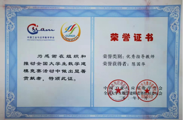陈国华教授从2006年开始担任数学建模竞赛总教练,负责组织全校本科生、研究生数学建模的教学、竞赛与培训工作。在此之前,贝博学生仅参加数学建模竞赛专科组,参赛规模与成绩一直未有突破。面对这一问题,陈国华教授几乎从零开始组建竞赛指导教师团队,精心设计竞赛训练环节,优化数学建模教学与竞赛培训内容。功夫不负有心人,贝博2007年第一次参加本科组数学建模国赛一举获得国家一等奖1项、国家二等奖1项、省一等奖2项,省三等奖3项的好成绩,其中陈国华教授自己指导的参赛队伍获得国家二等奖。此后,在陈国华教授的带领下,ballbet贝博bb艾弗森学生参加数学建模国赛的成绩越来越好,参赛规模和成绩屡创新高,2016年,贝博共获得国家二等奖5项,2018年,贝博获得国家一等奖2项、国家二等奖2项。2021年,贝博共有28组队伍参赛,17组获奖,获奖率达60.7%,创近年来参赛规模和获奖率新高。截至2021年,贝博参加全国大学生数学建模竞赛共获得国家一等奖8项、国家二等奖17项,省奖115项,其中陈国华教授自己指导学生参赛共获得国家一等奖1项、国家二等奖4项,省奖18项。此外,贝博研究生在数学建模竞赛中获国家三等奖4项,省奖20余项。本次陈国华教授获得全国优秀指导教师实至名归,这既是全国组委会对贝博历年数学建模成绩的充分肯定,也是对他十几年辛勤付出最好的回馈。
