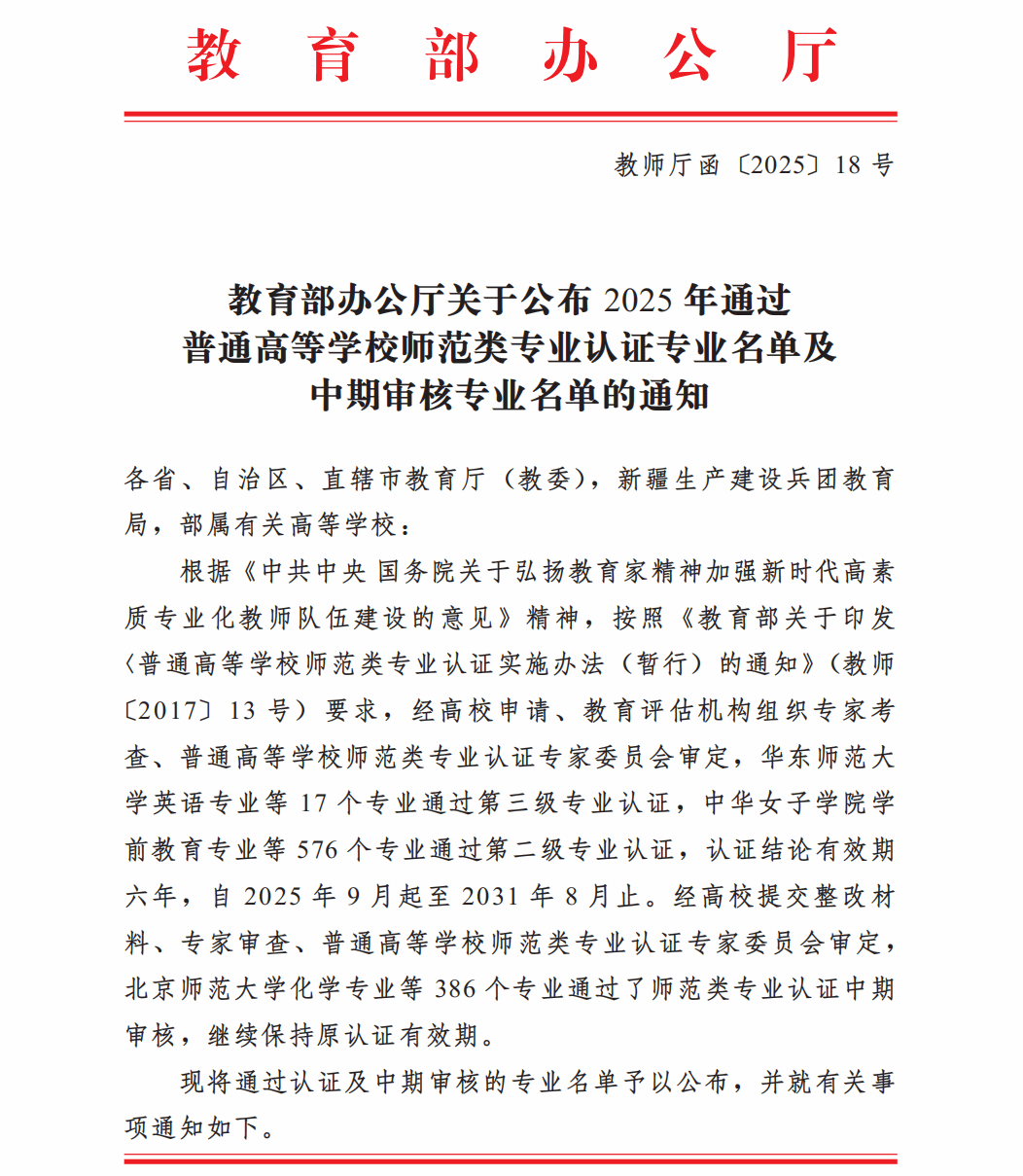近日,教育部办公厅公布2025年通过普通高等学校师范类专业认证专业名单,贝博数学与应用数学、化学两个专业顺利通过师范类专业第二级认证,认证结论有效期六年,自2025年9月起至2031年8月31日止。