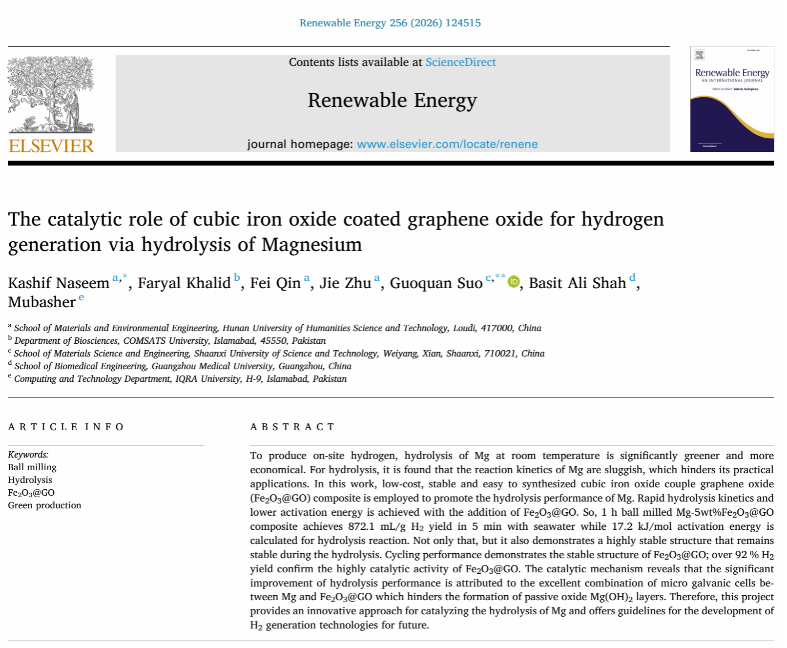 近日,贝博材料与环境工程学院Kashif Naseem博士在工程技术领域TOP期刊《Renewable Energy》(《可再生能源》)(中科院1区,IF:9.1)发表题为“The catalytic role of cubic iron oxide coated graphene oxide for hydrogen generation via hydrolysis of Magnesium”(《立方状Fe2O3修饰氧化石墨烯复合材料(Fe2O3@GO)助力镁的水解制氢》)的研究论文。ballbet贝博bb艾弗森为该论文的第一完成单位,Kashif Naseem博士为该论文的第一作者。