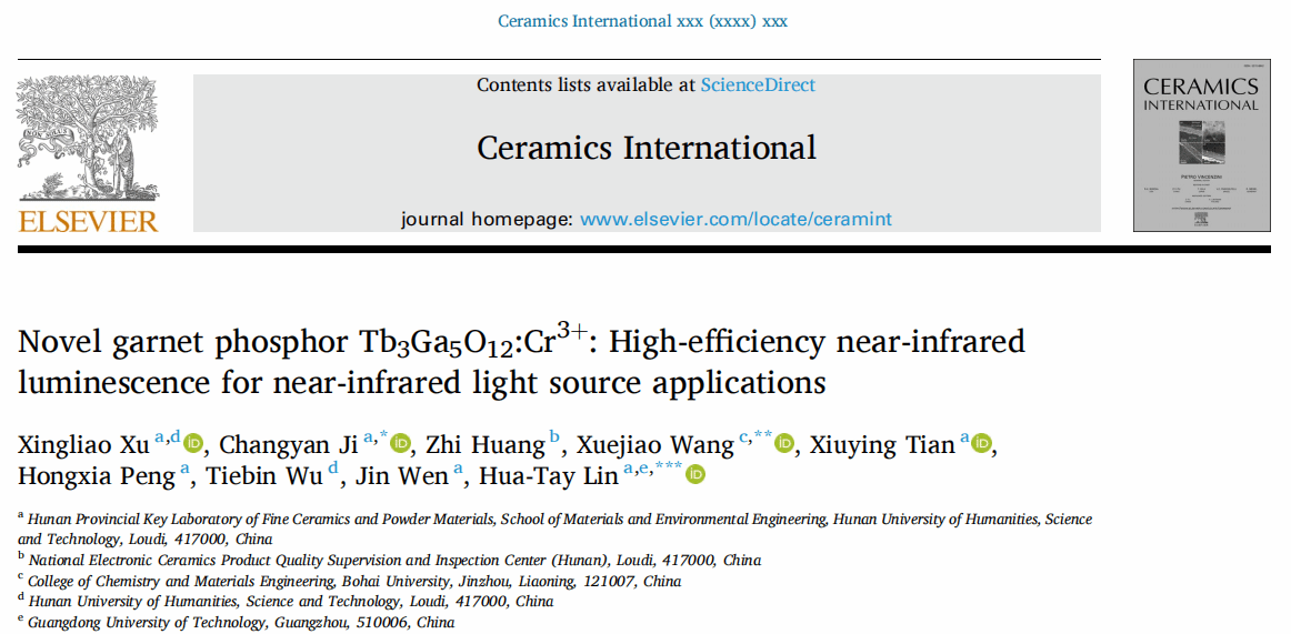 近日,贝博材料与环境工程学院汲长艳博士领衔的团队在材料科学领域国际知名期刊《Ceramics International》(《陶瓷国际》)发表重要研究论文,题目为“Novel garnet phosphor Tb3Ga5O12:Cr3+:High-efficiency near-infrared luminescence for near-infrared light source applications”(《新型石榴石基荧光粉Tb3Ga5O12:Cr3+的发光性能及近红外应用》)。该团队许星燎(贝博硕士研究生)为论文第一作者,汲长艳博士为第一通讯作者,ballbet贝博bb艾弗森为该论文的第一通讯单位。