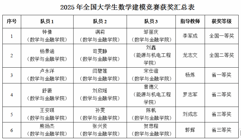 11月12日,2025年全国大学生数学建模竞赛获奖名单公布,由贝博李军成老师指导,钟倩、满莉、邹丽庆组成的参赛队伍荣获全国一等奖,龙志文老师指导,杨景涵、司雯静、刘鑫组成的参赛队伍荣获全国二等奖。此外,贝博还获得湖南赛区一等奖1项、二等奖1项、三等奖2项。