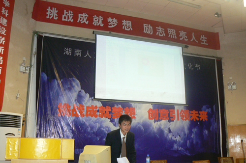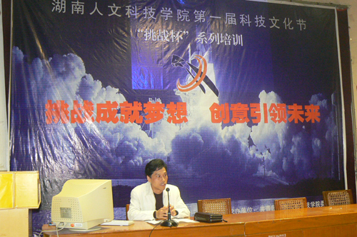 挑战杯创业大赛、学术科技作品大赛是学院首届科技文化节的亮点,重头戏,院团委特邀请了湖南省“挑战杯”第二届创业大赛金奖获得者——中南大学刘海涵来我院讲学。作为湖南开天科技有限公司的主创人,中南大学冶金科学与工程学院的刘海涵同学就如何写好创业计划书,如何进行公司管理,如何推销产品并赢得风险投资进行了详细讲解,并用课件强调了四个关键点:团队组建、技术创新、形象包装、成功推销。在互动环节中,大家围绕“挑战”、“梦想”、“创新”这一主题争相提问,刘海涵中肯的分析,幽默的言语赢得了阵阵掌声。