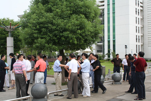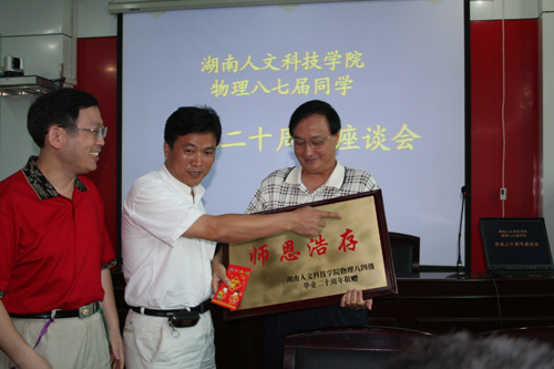 2007年7月14日下午,10多辆小轿车浩浩荡荡地驶入了ballbet贝博bb艾弗森的校门,物理八七届的校友50多人来院进行毕业20周年的座谈会。一进校门,大家走下车在“海园”广场热火朝天的聊起来,感叹良多——学院变化太大了,出乎我们的想象;老师还是我们记忆中的老师,女同学更显成熟美,男同学皮带长了、孔多了……短暂的交流之后,老师们亲自带大家观看了校园,并在“海园”广场合影留念;之后在学院五楼大会议室开了一次生动的座谈会,现任学院院长姜正国同志向同学们介绍的学院的发展与未来的规划,老师们一一发言,与同学们一起重温了二十年前的大学生活,到会的每一位同学用风趣的语言对毕业20周年的工作和生活做了简单的介绍,最后,朱国富、方旭中同学代表物理八七届全体同学向学院赠送了纪念品和捐款。
