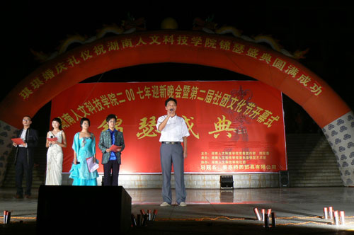 晚会在大型的歌舞《辉煌娄底》中拉开序幕。在节目正式开始前,院长助理刘铁铭同志发表了热情洋溢的讲话。他首先向来自全国各地的新生表示了热烈的欢迎,介绍了院里各社团发展的规模,强调了抓“三爱”促“三风”教育活动和大力发展社团文化的重要意义。