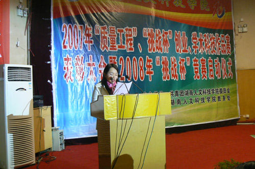 2008年1月8日晚7点,由院团委、教务处举办的2007年“质量工程”、“挑战杯”创业、学术科技作品赛表彰大会暨2008年“挑战杯”竞赛启动仪式在图书馆报告厅隆重举行。参加此次大会的有院党委书记黄懿斌,党委委员、副院长刘和云,党委委员、党办院办主任李高海,院长助理刘铁铭,院长助理蒋建初,科技处处长彭秧锡,院科协主席罗良才和各系分管团工作的领导、团总支书记、指导老师出席了大会。表彰大会由院长助理刘铁铭同志主持。