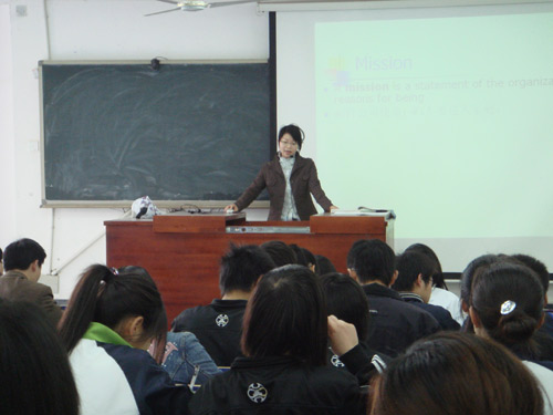 3月27日上午第一节课,教学楼5栋301室座无虚席,主讲教师刘海艳正用流利的英语讲授《管理学原理》。这是经济与管理科学系人力资源管理教研室首次举行的双语教学公开课。系党政领导与大部分教师都参加了这次活动。