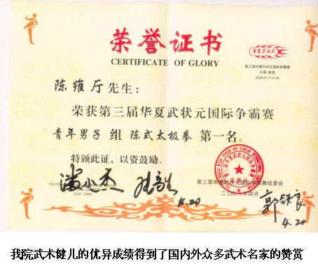 4月19日,由世界传统武术联合会主办、华夏武术文化发展中心承办的第三届华夏武状元国际争霸赛圆满落下帷幕。我院体育系选手陈维厅同学一举获得“青年男子组陈式太极拳”冠军。此次大赛有来自美国、新加坡、香港及中国内地26个省、直辖市的1329名运动员参赛。