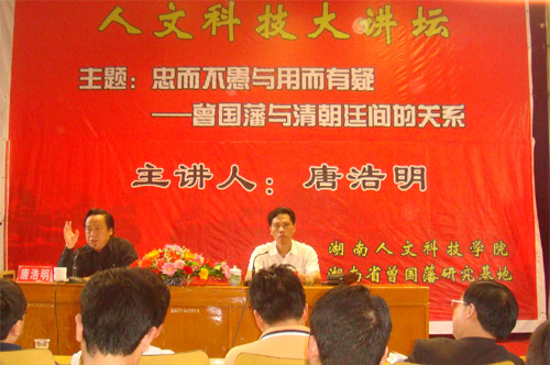 应湖南省曾国藩研究基地和学校之邀,5月19日下午,第九、十届全国政协委员、湖南省作家协会主席、岳麓书社首席编辑、贝博曾国藩研究所名誉所长唐浩明先生在贝博图书馆报告厅为近400名师生作了曾国藩专题研究讲座。讲座由省曾国藩研究基地首席专家、我院教授刘铁铭同志主持,院长姜正国教授、副院长刘和云教授及省内的一些专家全程聆听了讲座。