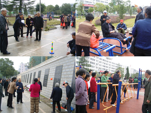 11月18日,校离退办在学校海园广场的健身场举办了“离退休教职工趣味运动会”。运动会设有“投篮”、“套圈”、“投镖”、“呼拉桥”、“仰卧起坐”、“慢步机”等六个比赛项目,这些比赛项目适合老年人的特点,运动量小、趣味性强,很受离退休教职工的欢迎,居住在娄底市区的老同志们都来参加了比赛。
